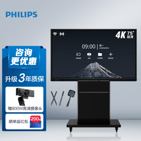 飛利浦智能會議平板 飛揚版75英寸視頻會議一體機 4K觸摸屏電子白板 商用會議電視顯示器智慧屏 3352T支架版